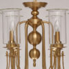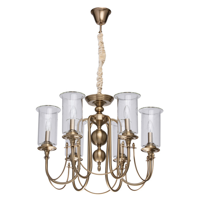 Дизайн в актуальном стиле неоклассики. Традиционная форма свечи, обрамленная высоким стеклянным плафоном создает яркое равномерное освещение. Благородный цвет латуни и минималистичный декор позволяют светильнику стать украшением большинства интерьеров. Полная семья решает задачи полного и зонального освещения