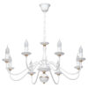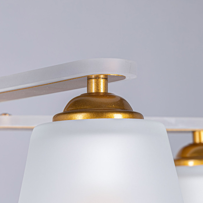 Металлическое основание светильника окрашено в цвет перламутрового золота. Светильник декорирован стеклянными матированными плафонами и матовым акрилом на рожках.